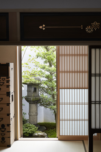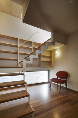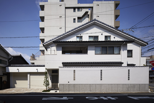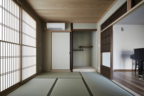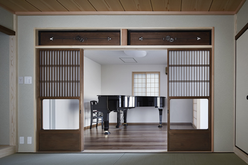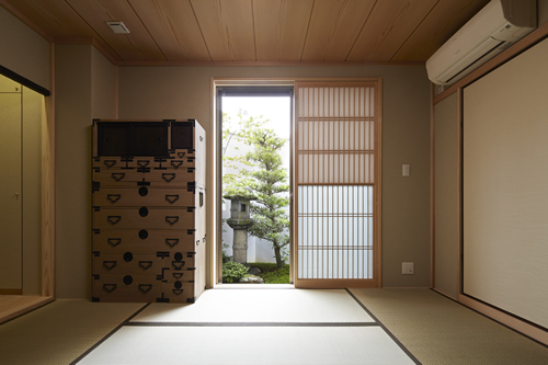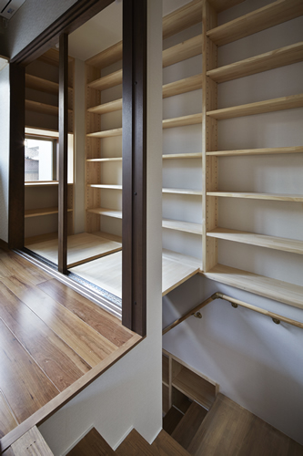 「西本願寺/歴史遺産型美観地区」での建替え。景観や耐火建築物など、規制の厳しい条件がありました。従来のRC造の問題点を解消する為、「外断熱工法」を取り入れました。サッシには、エコガラス(高断熱Low-E膜付)を選択し、夏・涼しく、冬・暖かい構造としました。ピアノ室は、防音/壁と扉を使用しています。階段収納をデザインし、将来の二世帯空間にも考慮して、計画しています。 出来る限り、既存の建具や敷石などを再利用し、顧客の「思い出を大切にされる心」が、詰まっています。